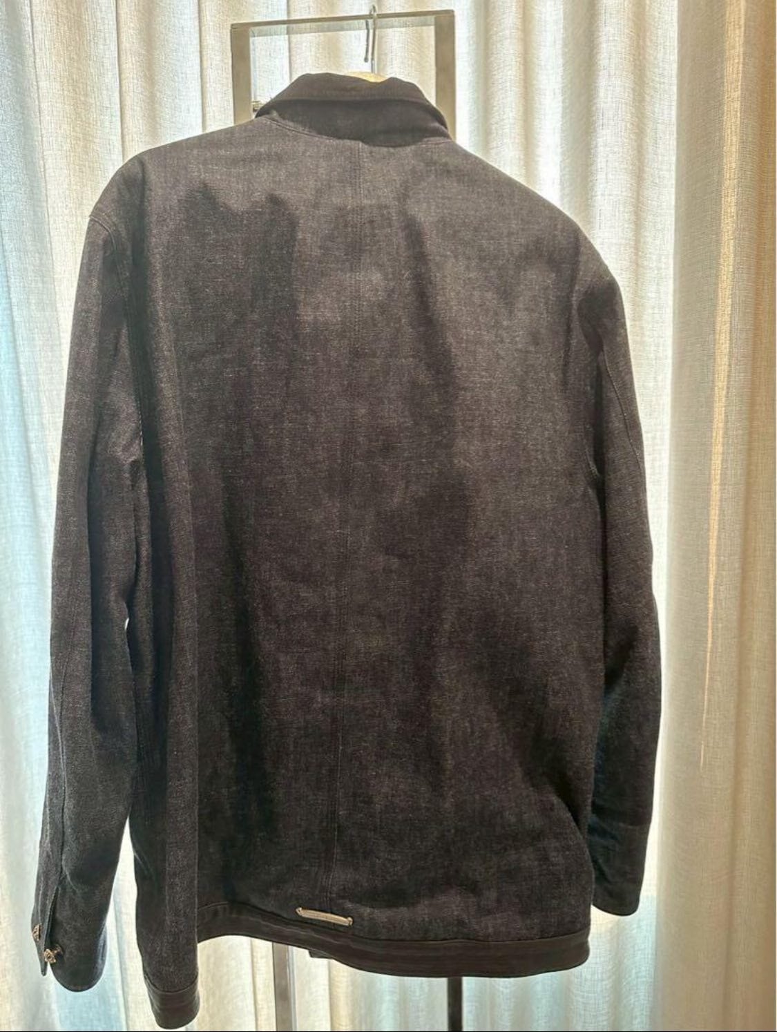 ダークデニム素材にコーデュロイ襟、レザー調のフラップポケットを備えたジャケット。
