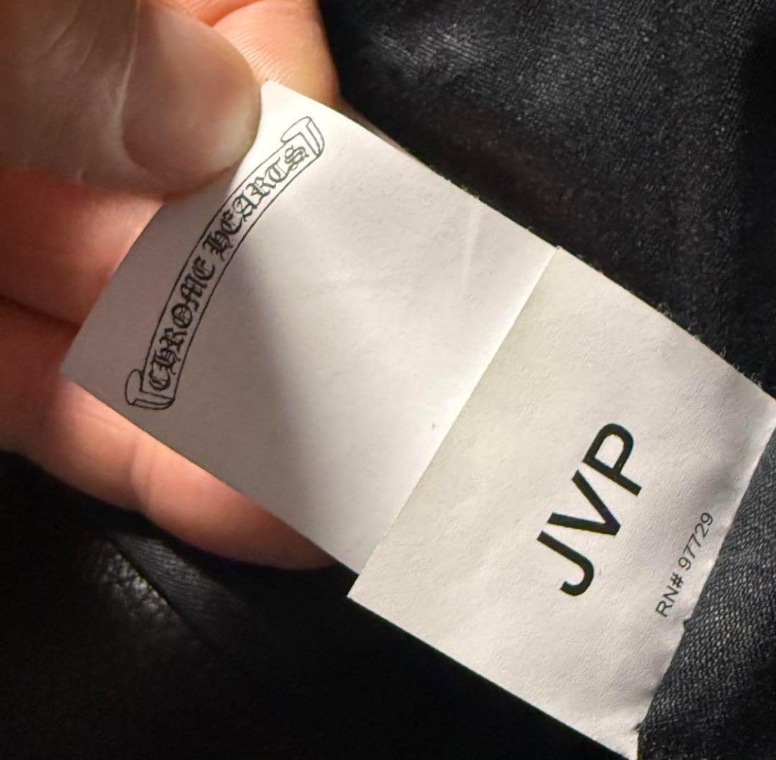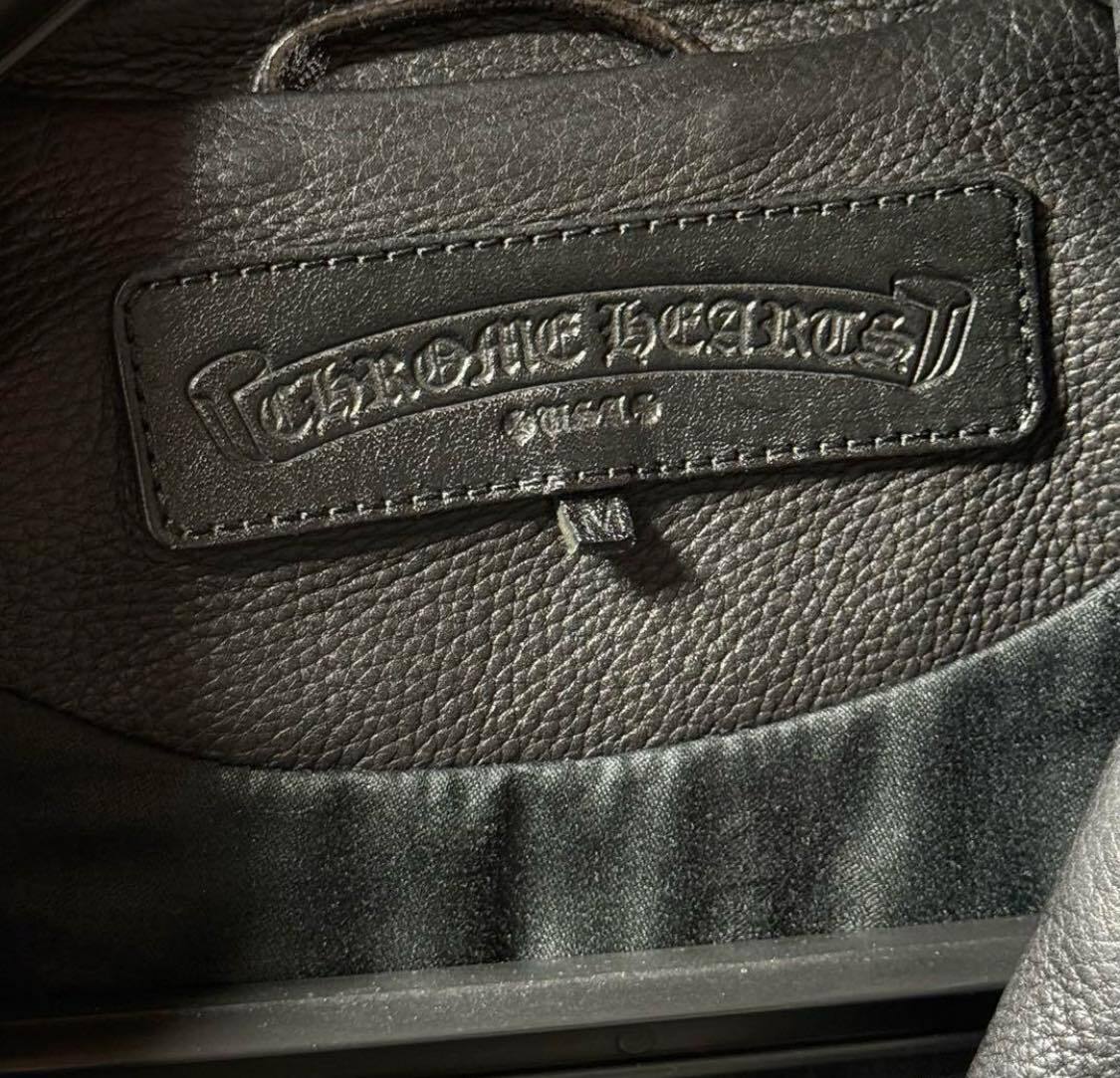 Chrome Heartsのブラックダブルライダースジャケット、メタルボタン付き。