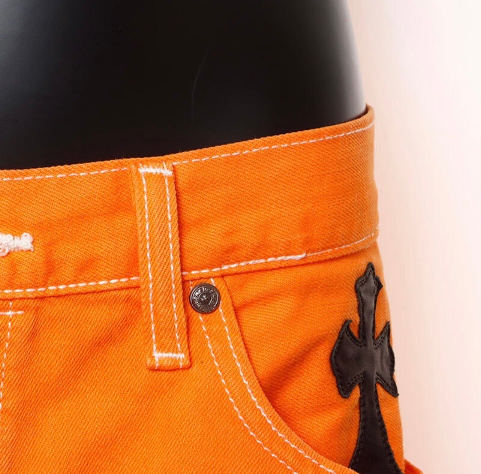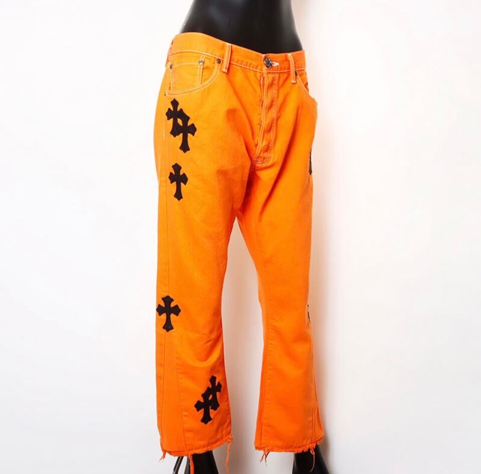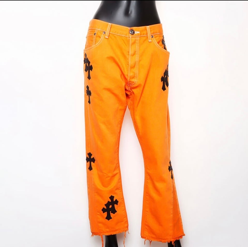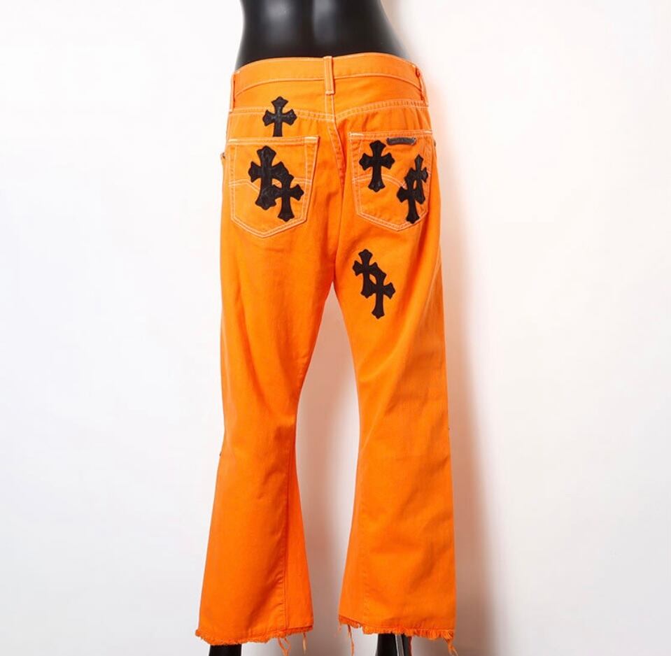 美品 CHROME HEARTS レザー クロス パッチ ワーク コットン Size:36 パンツ オレンジ