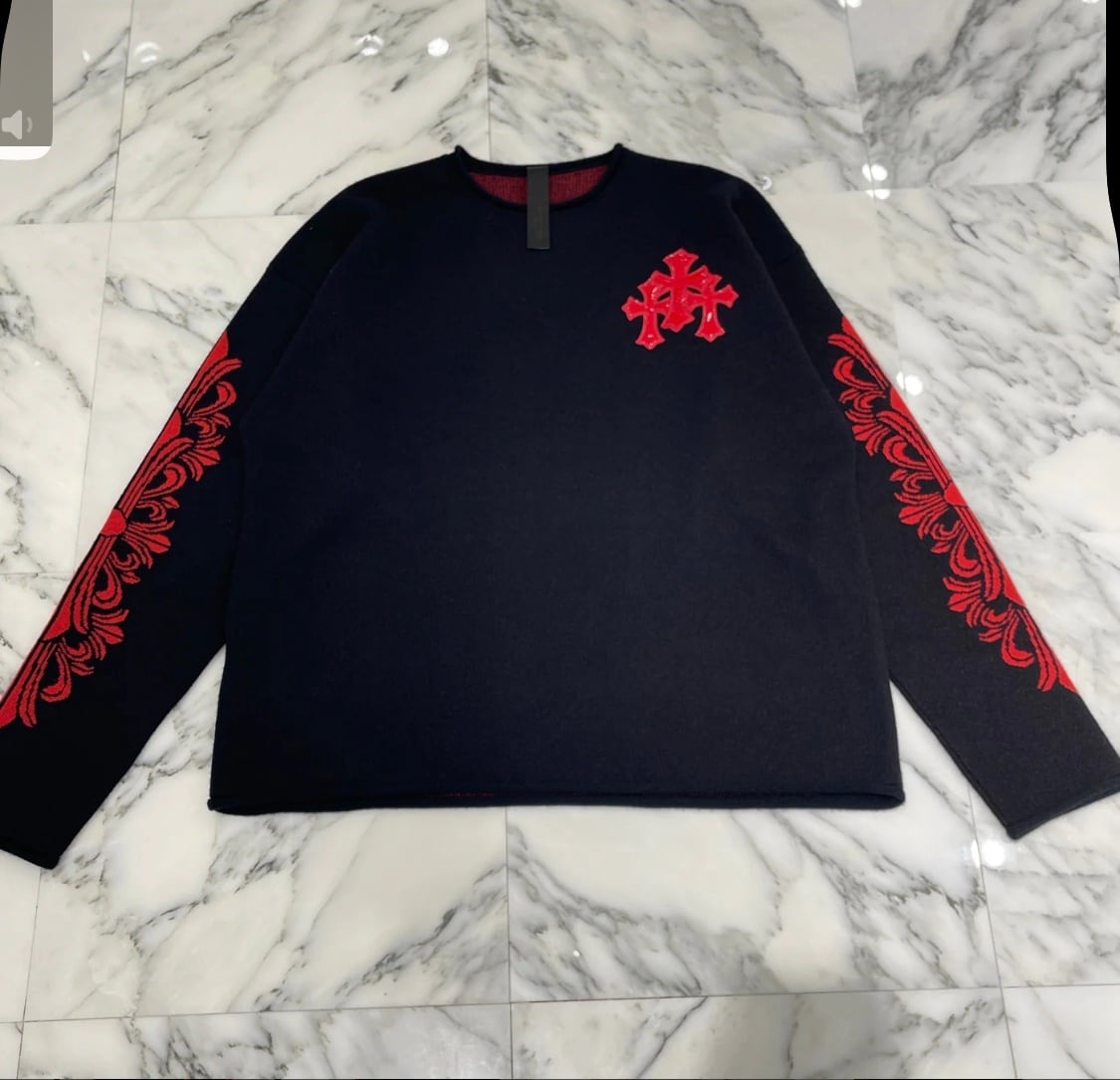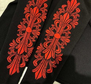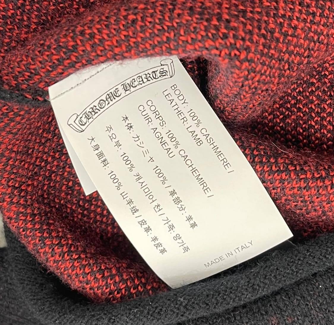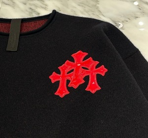 【商品名】クロムハーツ ワイノット セメタリークロス パテントレザーパッチ カシミヤ ニットセーター 袖フローラルクロス クロスパッチ ブラック×レッド サイズONE SIZE(68~112)
