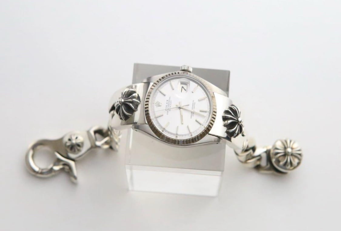 ロレックスの名作「デイトジャスト1601」に、クロムハーツ純正シルバーブレスレットを組み合わせた特別仕様モデルです。