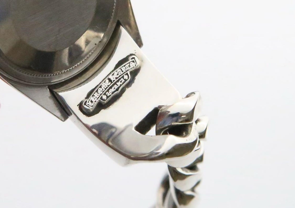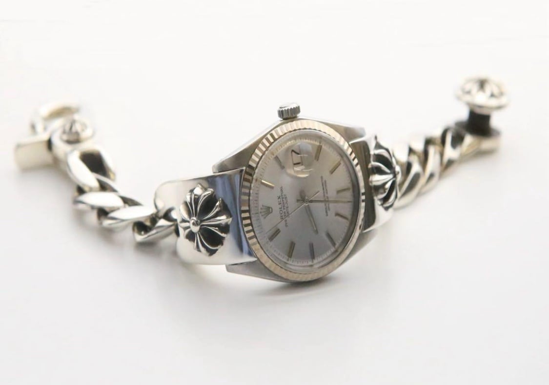 ケースとダイヤルはロレックス本来のクラシックな雰囲気を保ちながら、ブレスレット部分にクロムハーツの重厚なスターリングシルバーが採用され、唯一無二の存在感を放ちます。