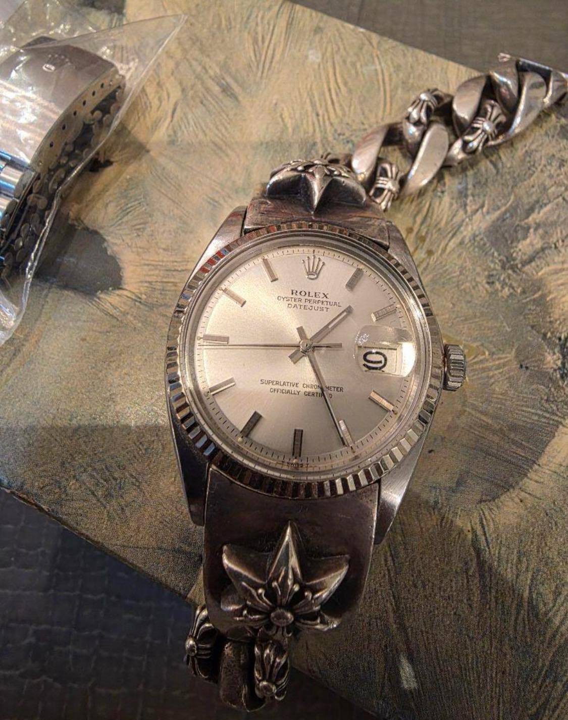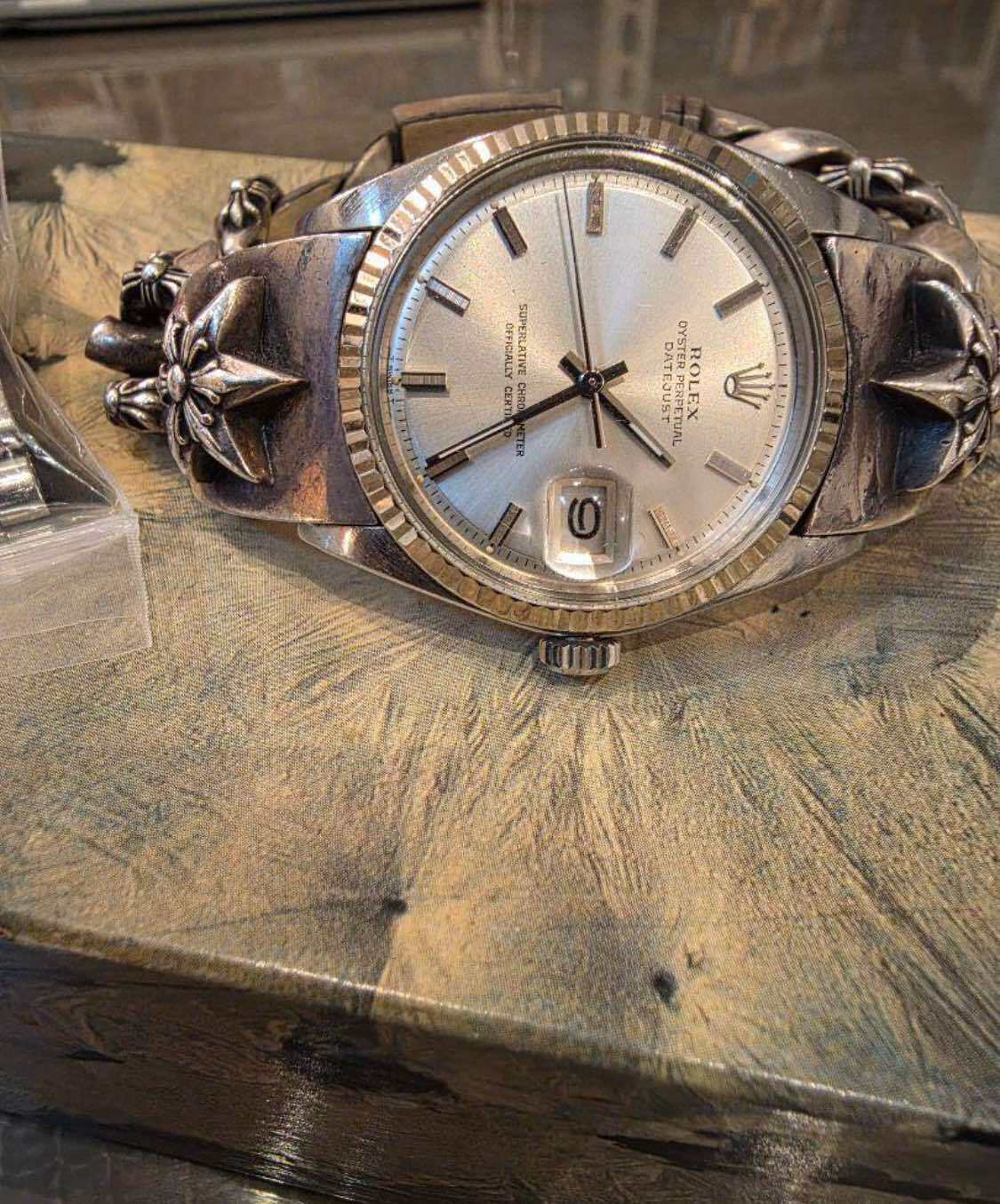 ロレックスの名作「デイトジャスト」に、クロムハーツ純正シルバーブレスレットを組み合わせた特別仕様モデルです。元気に動いてます。手巻きです。