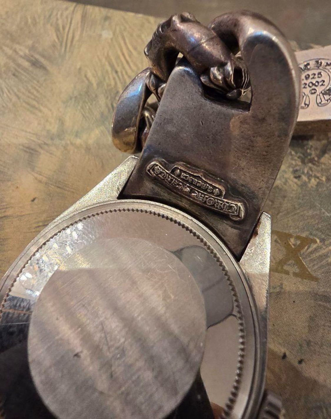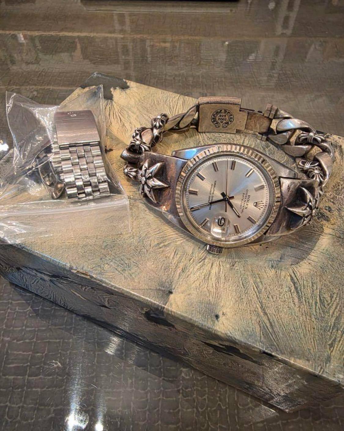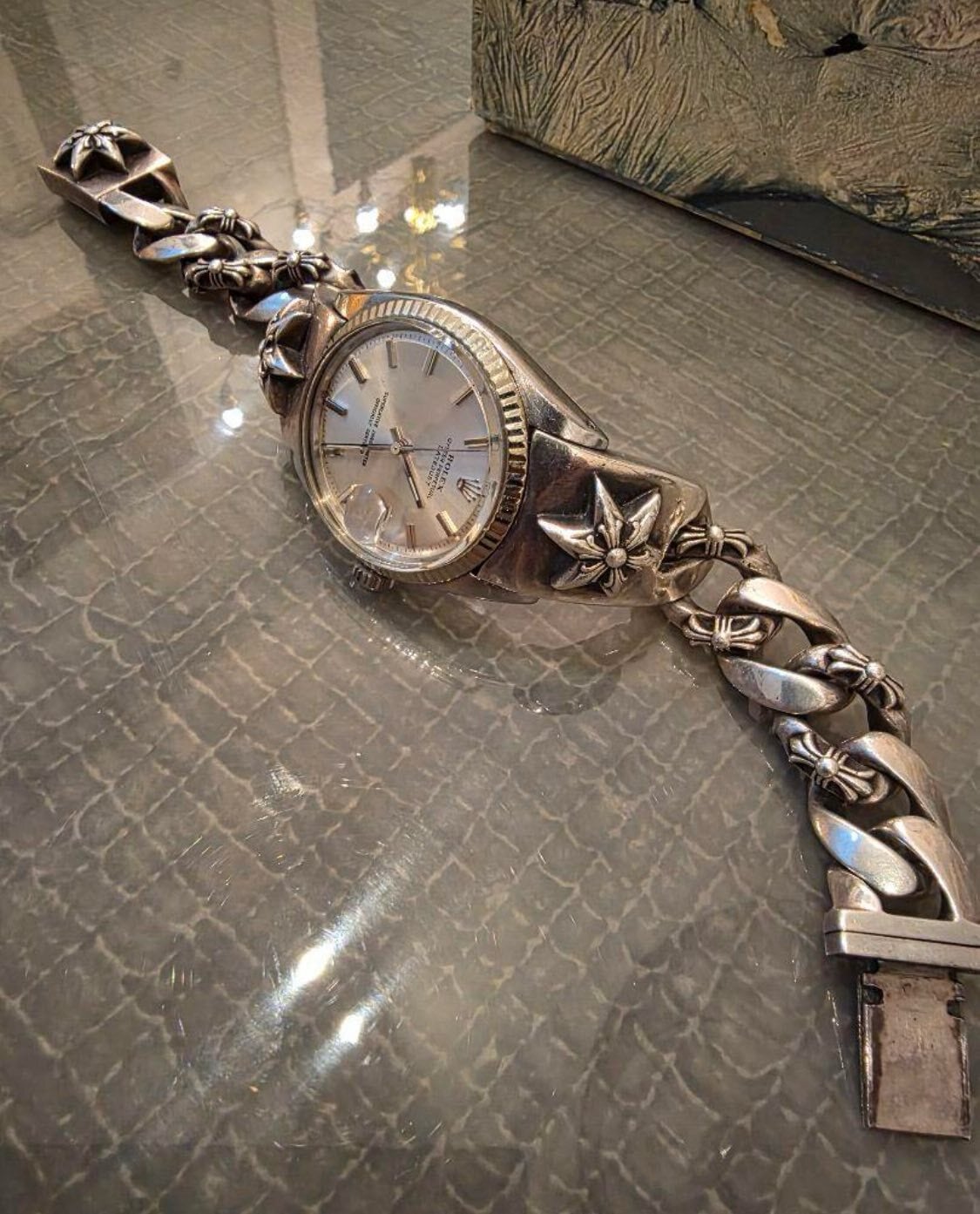 ケースとダイヤルはロレックス本来のクラシックな雰囲気を保ちながら、ブレスレット部分にクロムハーツの重厚なスターリングシルバーが採用され、唯一無二の存在感を放ちます。