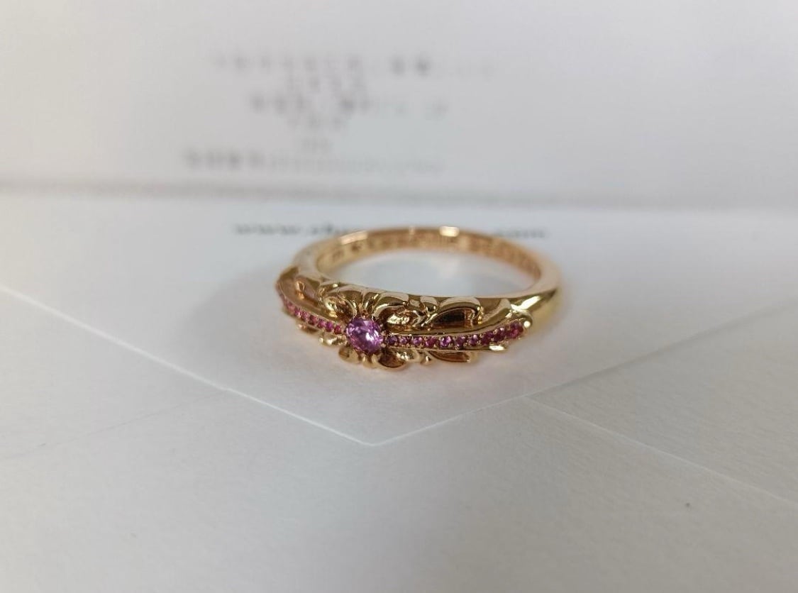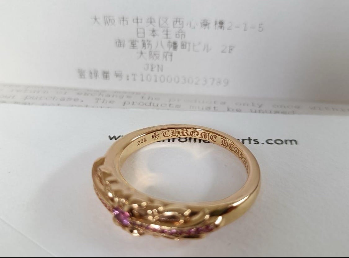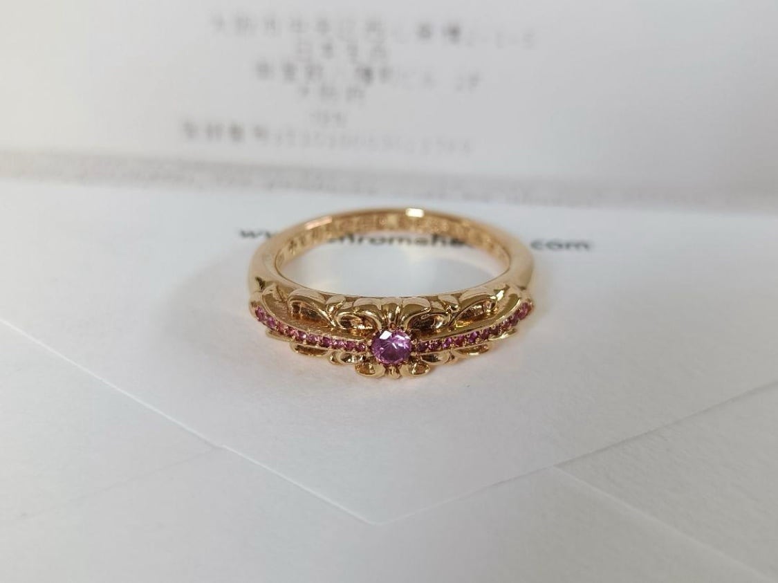 クロムハーツの22K「ベイビークラシック フローラルクロス リング」、希少なピンクサファイア入りのモデルです。