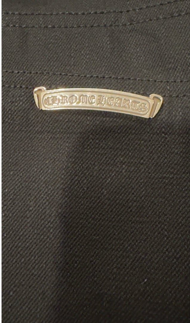 ブラックのストレートデニム、Chrome Heartsのメタルロゴ付き。
