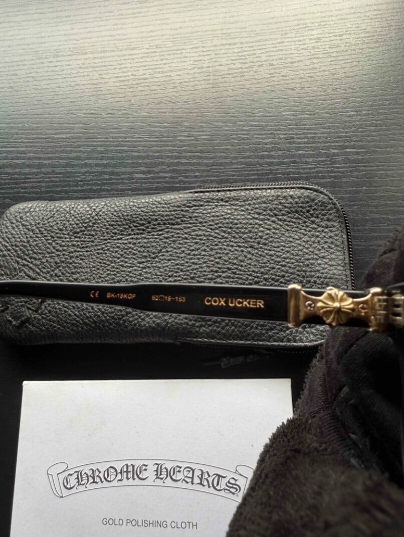 クラシックなブラックフレームのCHROME HEARTSメガネ、付属品あり。