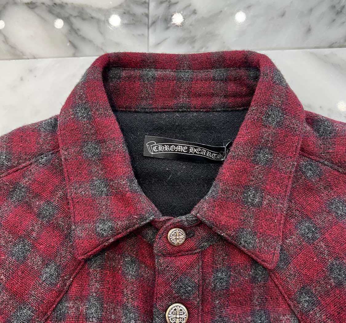 クロムハーツ クロスボールボタン ビスコース ウール チェックシャツ ジャケット ウール素材混 クロスレザーパッチ チェック柄 シルバー925 レッド×ブラック サイズM