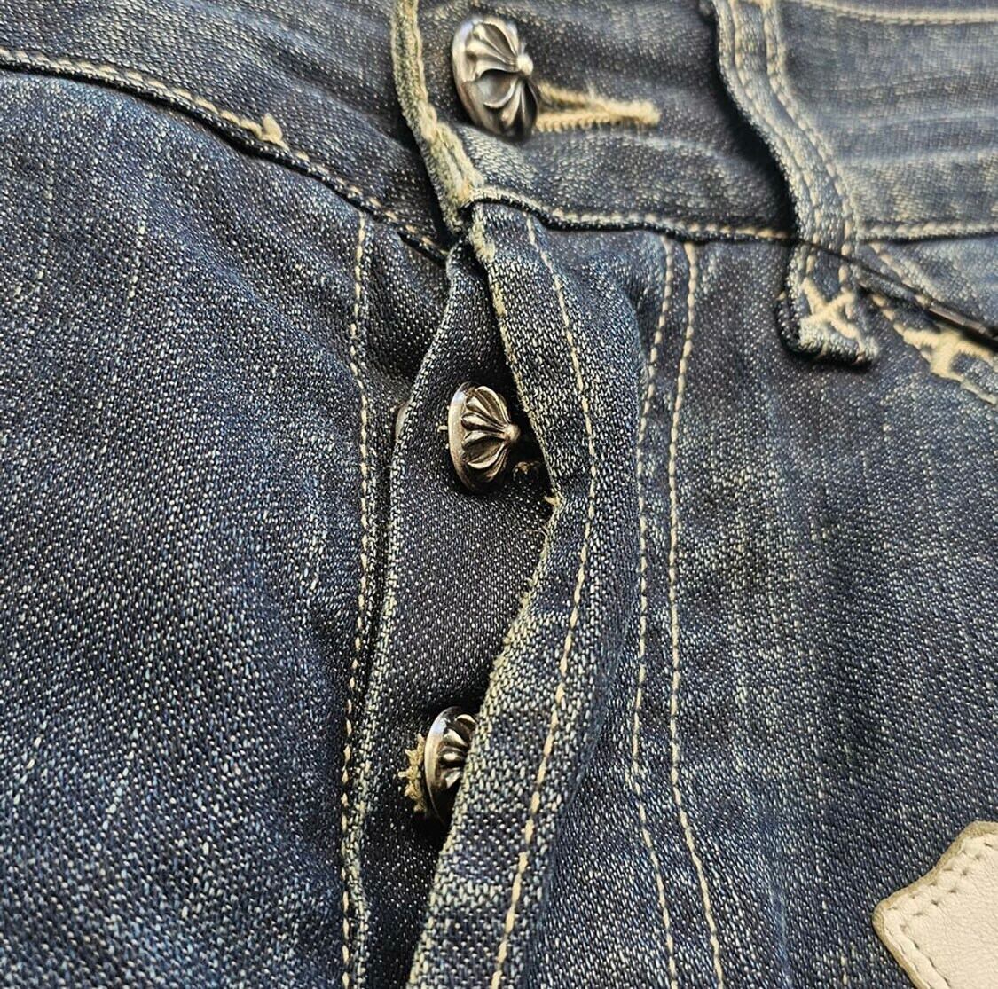 クロムハーツ × ドルチェ&ガッバーナ ヴィンテージ クロスレザーパッチ ジーンズ デニムパンツ クロスボールボタン ボタンフライ CHプラス装飾 レザーパッチ クロスパッチ インディゴ×ホワイト サイズ44