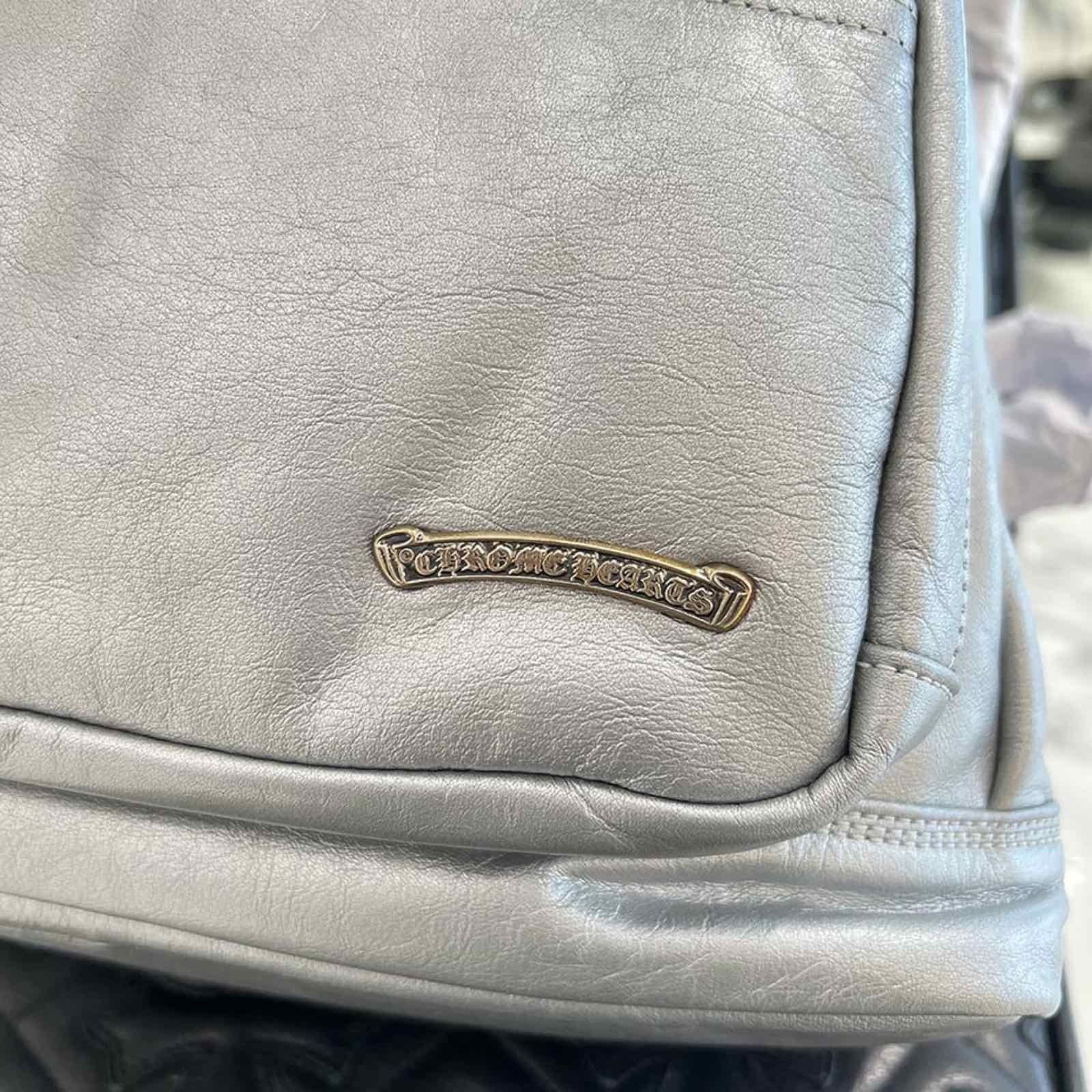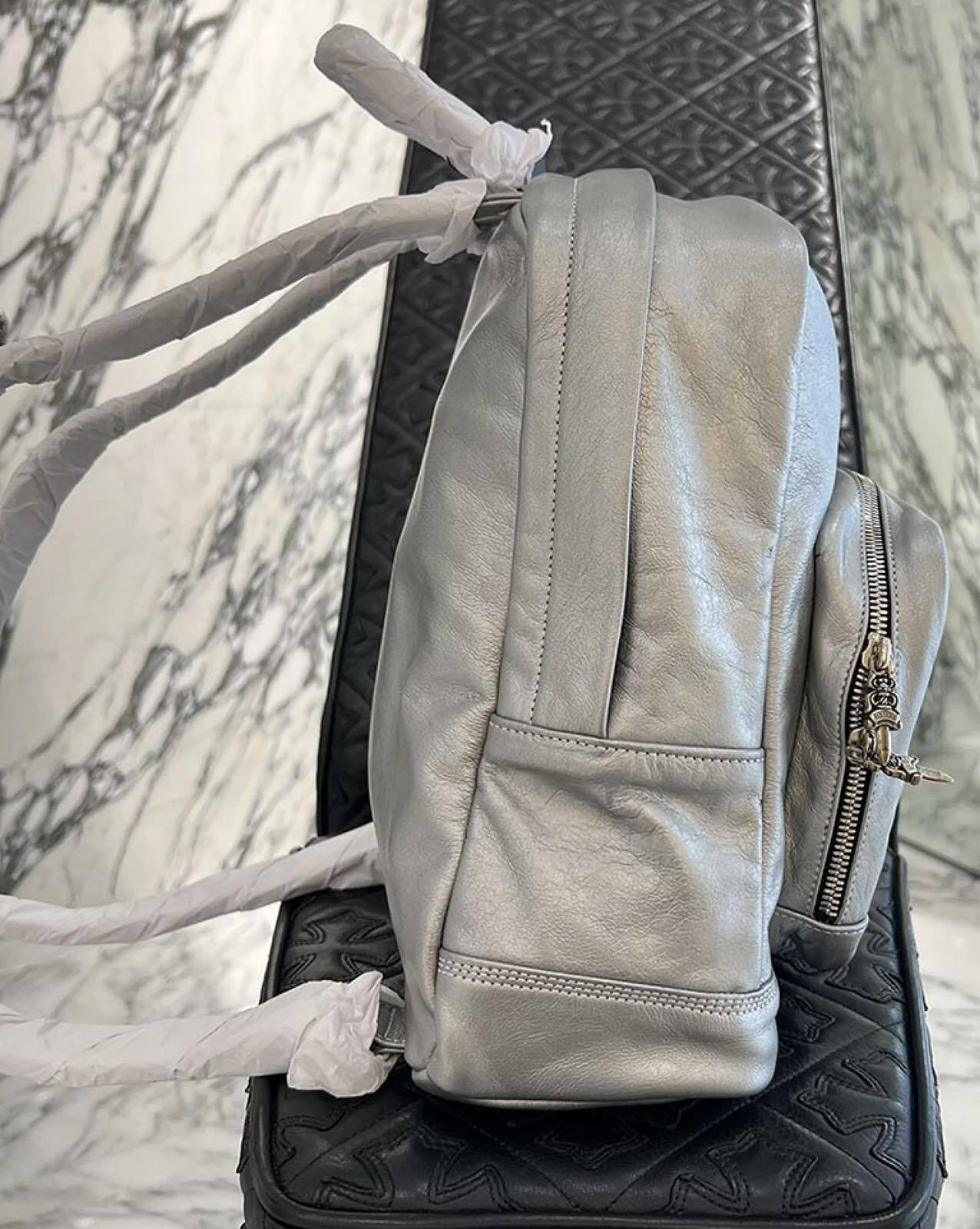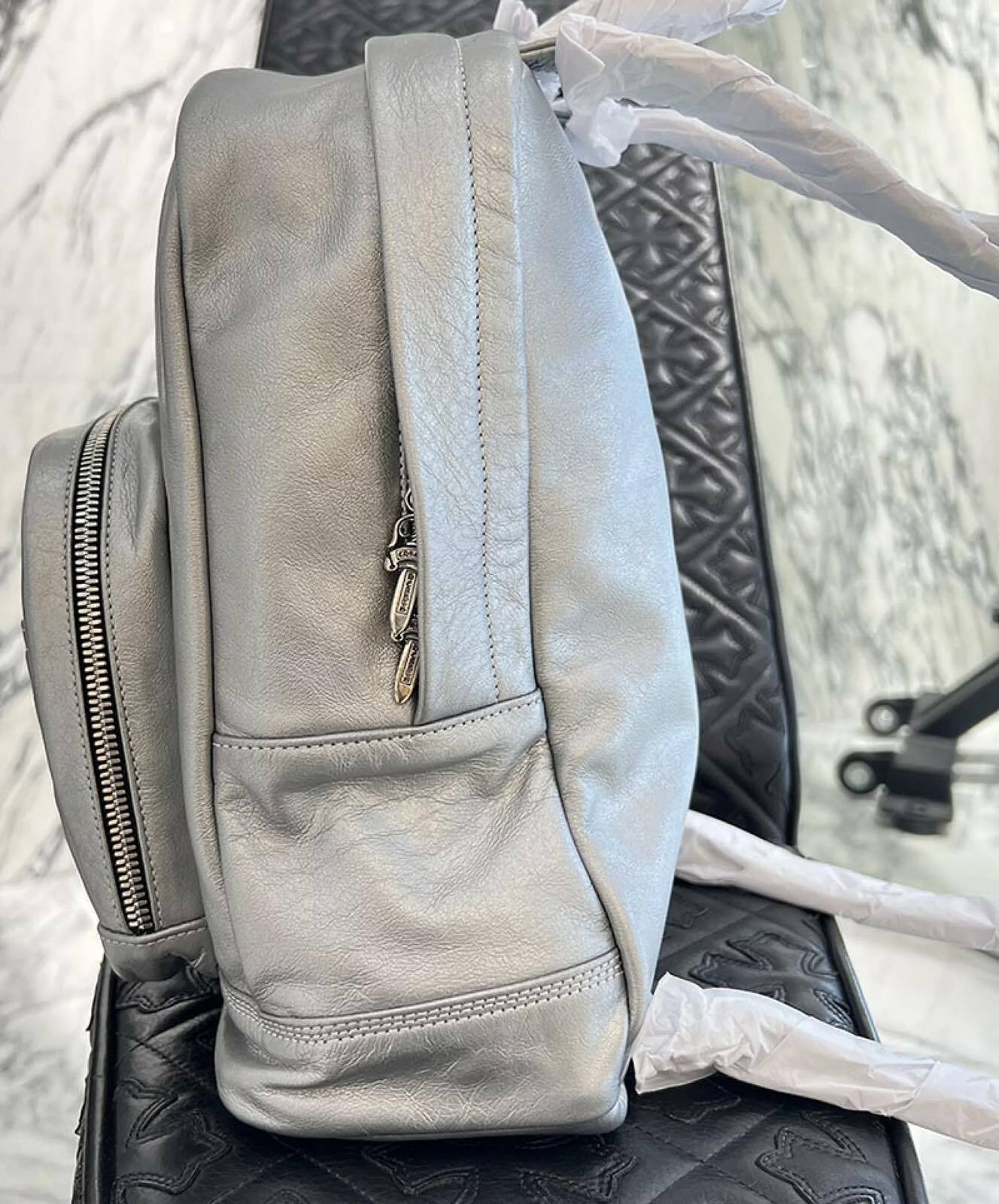 CHROME HEARTS クロムハーツ 7th grade メタリックシルバー レザーバックパック リュックサック レザーバッグ ダガージップ スクロールラベル カーフレザー シルバー925 メタリックシルバー