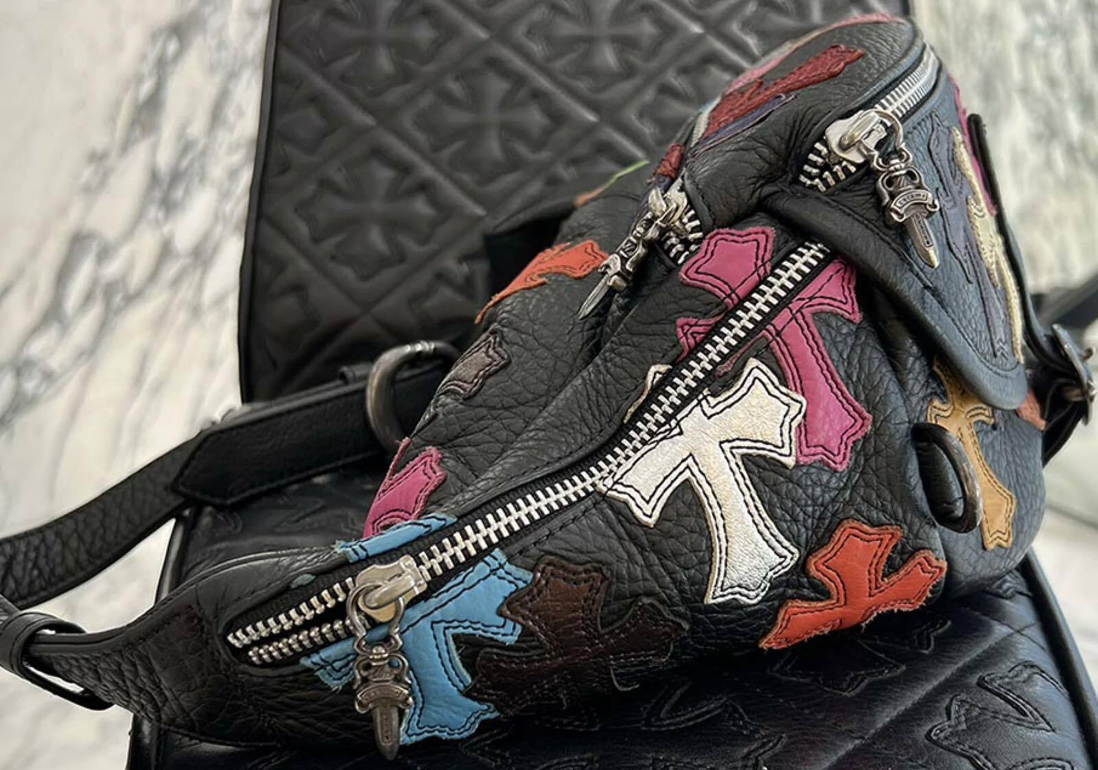 CHROME HEARTS クロムハーツ マルチカラー セメタリークロスパッチ 1スナットパック ミディアムレザー ウェストバッグ ショルダーポーチ レザーバッグ ダガージップ シルバーロゴプレート カーフスキン 5ポケット ブラック×マルチカラー