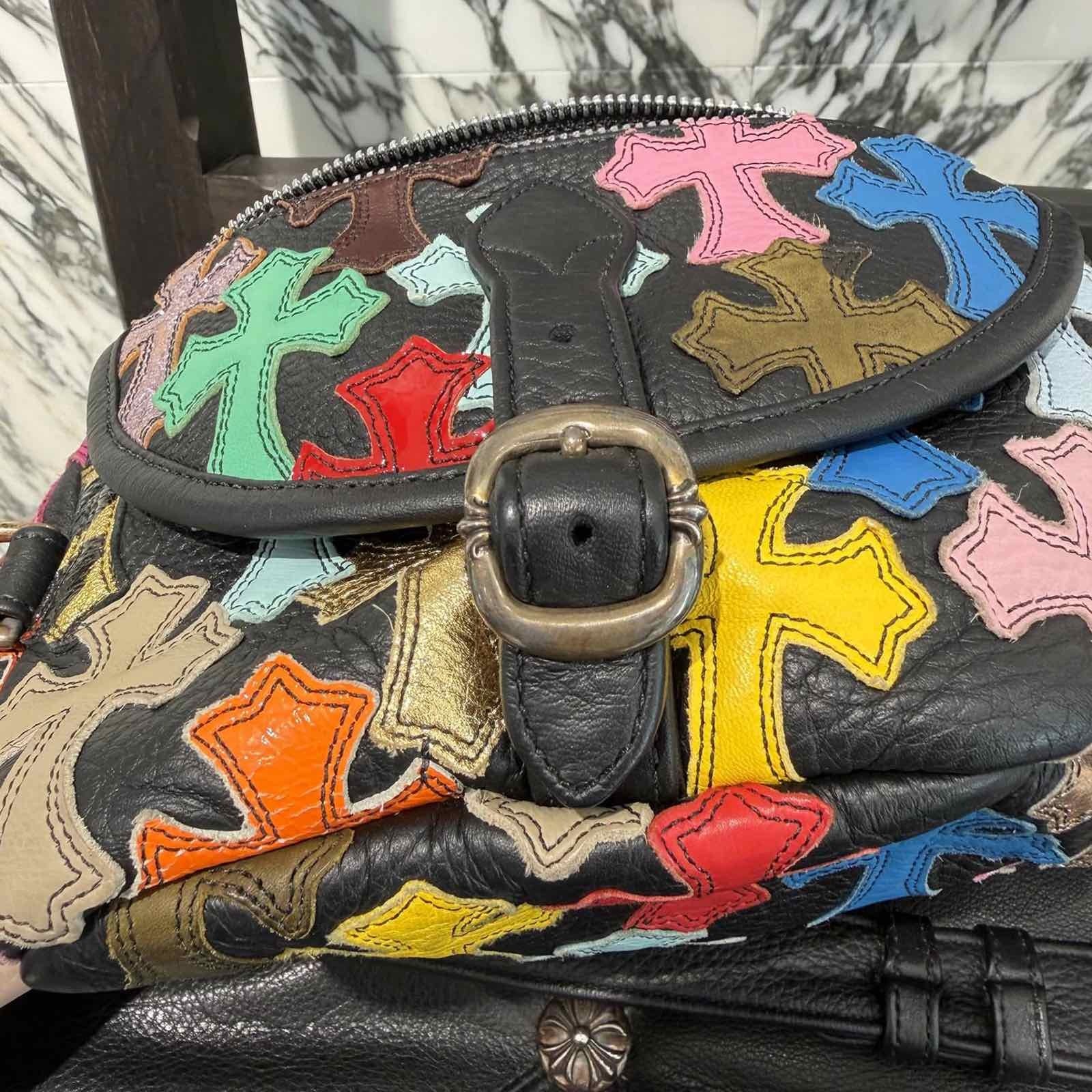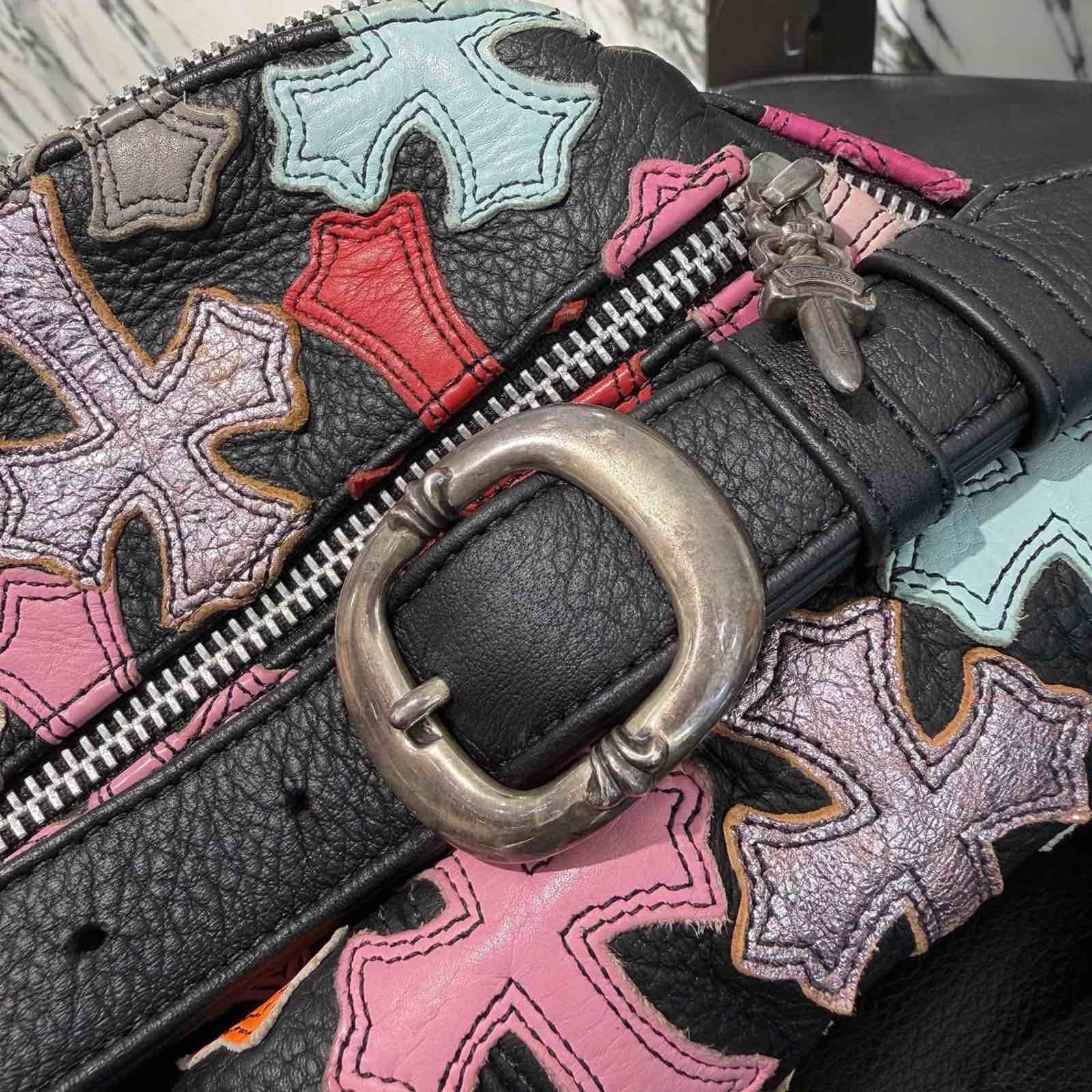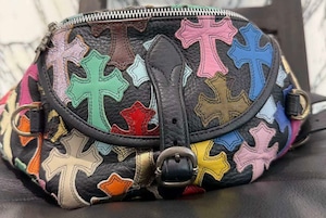 CHROME HEARTS クロムハーツ マルチカラー セメタリークロスパッチ 1スナットパック レザー ウェストバッグ ショルダーポーチ レザーバッグ ダガージップ シルバーロゴプレート カーフスキン 5ポケット ブラック×マルチカラー