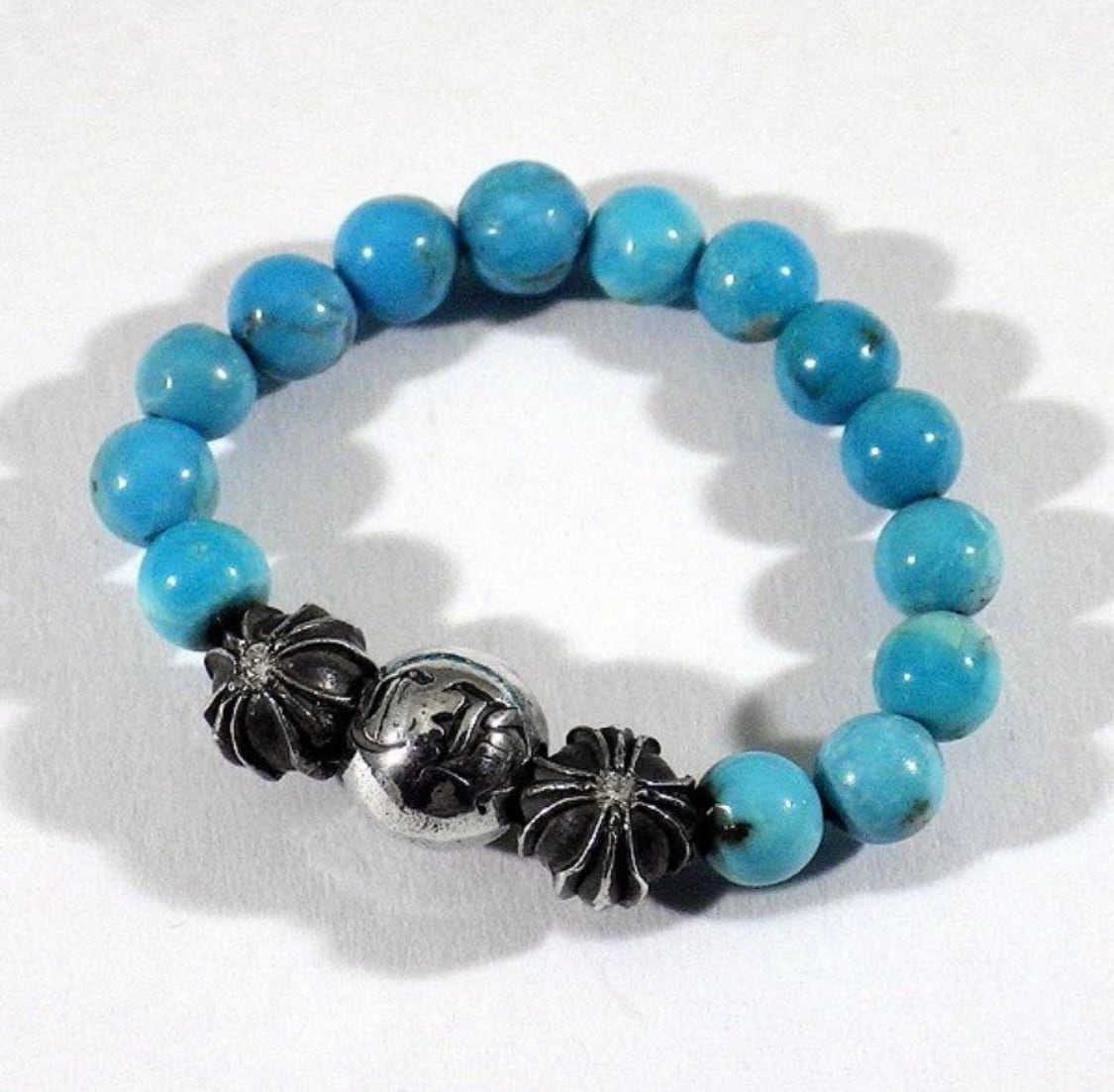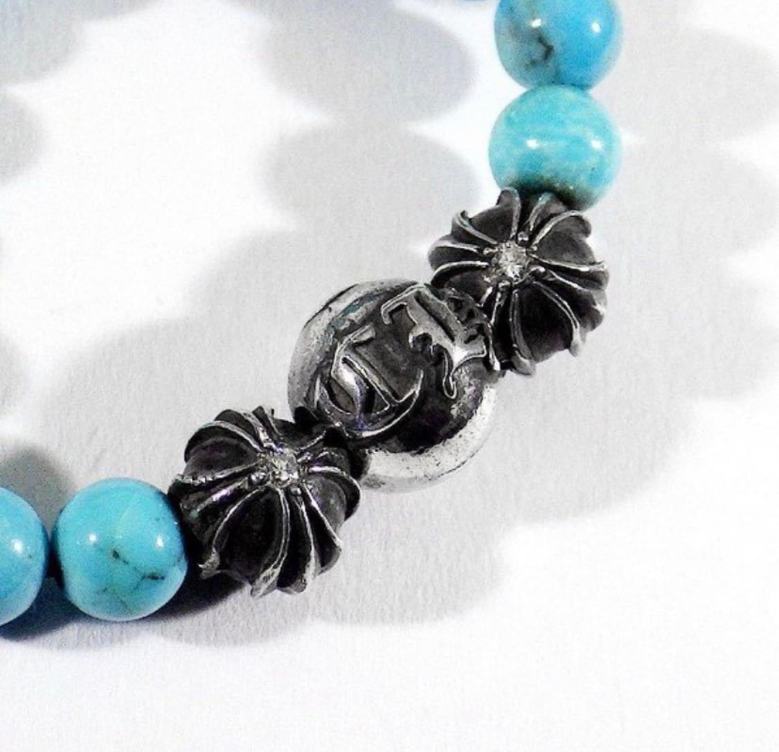 クロムハーツ ビーズリング ターコイズ ダイヤモンドです。ほぼ未使用に近い状態となり、クロスボールにはダイヤが留められております。メンズ、レディースどちらにも人気の高いおすすめアイテムです。